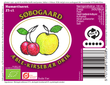Søbogaard Æble-Kirsebærdrik er en drik lavet ved at kombinere økologiske æbler og kirsebær. Denne type drik er populær på grund af sin friske smag. Æbler giver en sød og frisk smag til drikken, mens kirsebær tilføjer en let syrlighed og en dyb rød farve. Både æbler og kirsebær er rige på antioxidanter, vitaminer og mineraler.