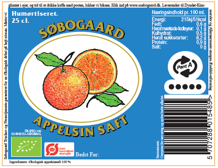 Søbogaard appelsinsaft er lavet af 100% økologiske appelsiner og er fri for kunstige tilsætningsstoffer og konserveringsmidler. Saften er kendt for sin naturlige og forfriskende smag, og den har en høj kvalitet, som har gjort den populær i både Danmark og andre lande.