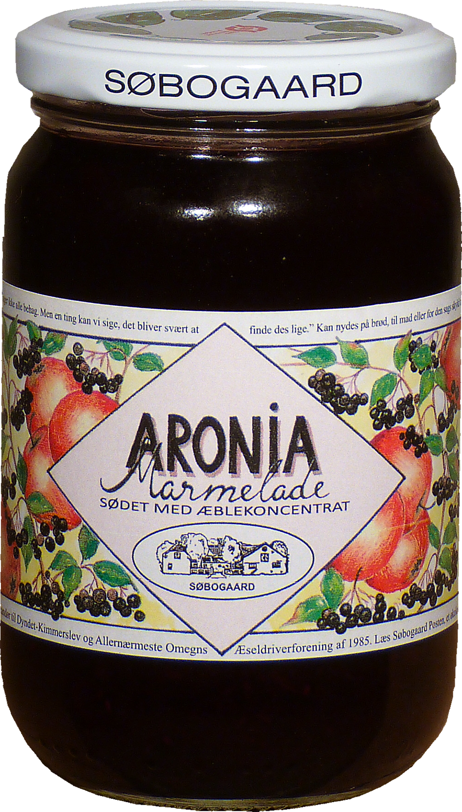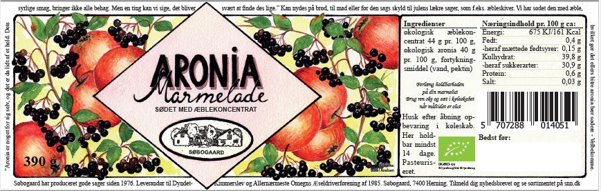Søbogaard´s Aroniamarmelade er fremstillet af aronia-bær, også kendt som aronia melanocarpa eller sorte chokebær. Det er små mørke bær, der vokser på en busk med samme navn. Aronia-bær er små, runde og har en dyb mørk lilla eller sort farve. De ligner nogle gange blåbær, men de er normalt lidt større og har en mere skinnende overflade. Aronia-bær har en intens, lidt bitter og tør smag, der kan være overvældende, hvis de spises alene. Marmeladen er en anelse syrlig i smagen, da den ikke er tilsat sukker, men er sødet med økologisk æblekoncentrat. Marmeladen kan anvendes både som pålæg på brødet, i en smoothie, topping på morgenmaden, til oste- og dessertbordet eller bagværk.