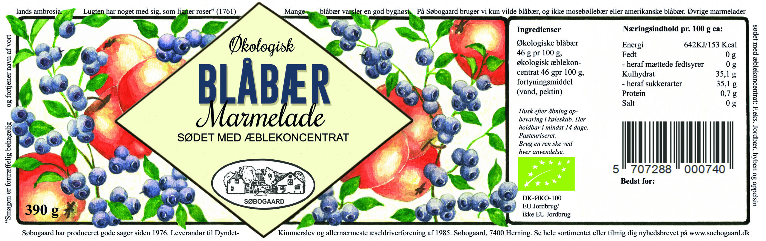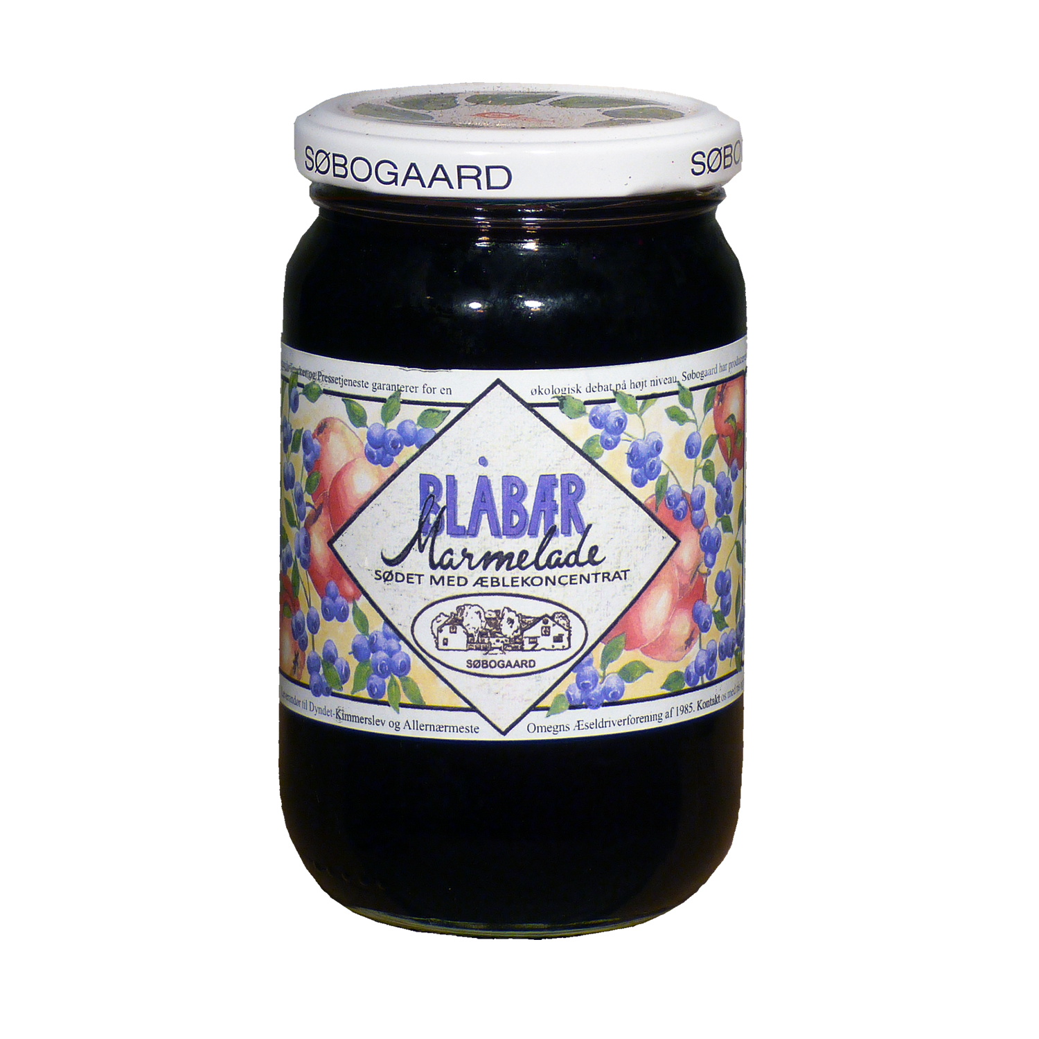 Søbogaard´s blåbærmarmelade er fremstillet af vilde blåbær af bedste kvalitet. Den er fremstillet af godkendte økologiske blåbær. Produktet er med respekt for miljøet og bærene forarbejdet med kærlig hånd til et virkeligt kvalitetsprodukt. Blåbærmarmelade kan spises på mange måder. Den er skøn på ristet brød, pandekager, vafler eller som fyld i bagværk som muffins eller tærter. Den kan også bruges som et tilbehør til ost eller som smagsgiver i forskellige retter, både søde og salte. Ingredienser: Økologiske vilde blåbær, økologisk æblekoncentrat, vand og pektin 400 gram