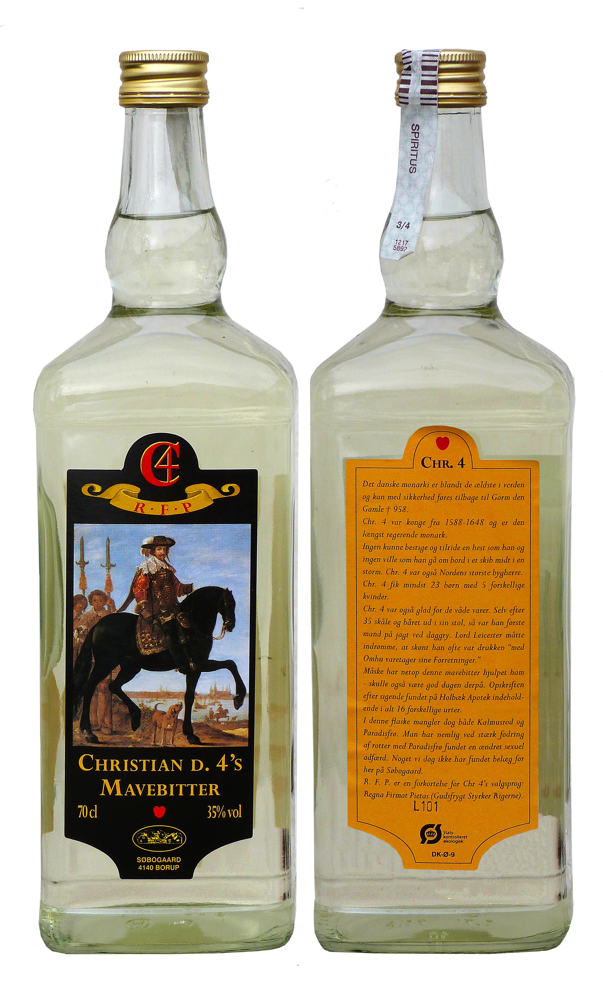 Det danske monarki er blandt de ældste i verden og kan med sikkerhed føres tilbage til Gorm den Gamle † 958. Chr. 4 var konge fra 1588-1648 og er den længst regerende monark. Opskriften skulle eftersigende være fundet på Holbæk Apotek og indeholdte 16 forskellige urter. I vores mangler der dog både Kalmusrod og Paradisfrø, da disse ikke længere må bruges.