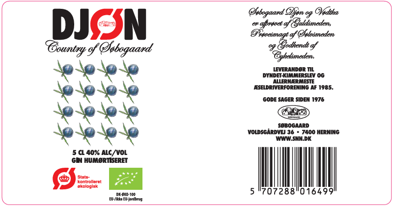Søbogaard Djøn er afprøvet af Guldsmeden, Prøvesmagt af Sølvsmeden og Godkendt af cykelsmeden. Enebær er den primære ingrediens i gin og giver drikken dens karakteristiske smag. Søbogaard Djøn er mild i smagen og derfor en glimrende makker i diverse cocktails og drinks, da smagen ikke bliver dominerende. Vi kan anbefale den i følgeskab med vores økologiske mango sirup og vores økologiske lemon sodavand. 5 cl. flaske. 40 % alc.