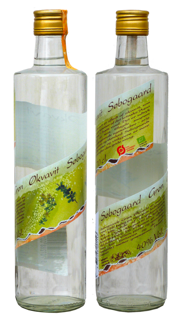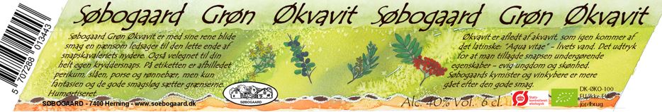 Søbogaard Grøn Økvavit er med sine rene blide smag en nænsom ledsager til den lette ende af snapsekavaleriets nydere. Også velegnet til din helt egen kryddersnaps. På etiketten er afbilledet perikum, slåen, porse og rønnebær, men kun fantasien og de gode smagsløg sætter grænserne. Humørtiseret.