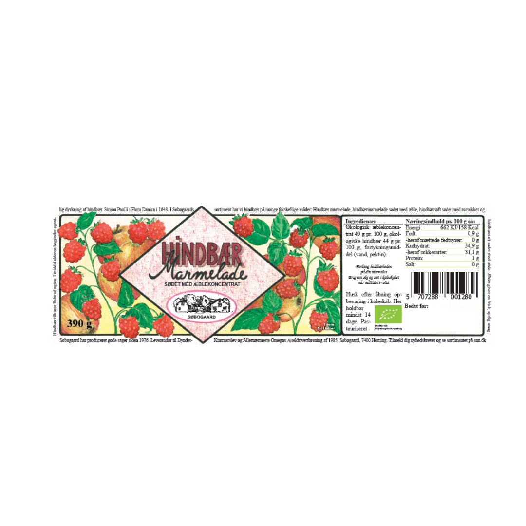 Søbogaard´s Hindærmarmelade æblesødet, er en klassiker i marmelade samlingen. Hindbær er små, saftige bær, der er kendt for deres søde smag og karakteristiske lyserøde til røde farve. De hører til Rosaceae-familien og er beslægtet med andre bær som brombær og bjørnebær. Hindbærbusken er en flerårig plante, og bærene er typisk små, runde og dækket af små hår, der giver dem en let dunet overflade. Der findes forskellige varianter af hindbær, inklusive røde, sorte og gule. Hindbær har en sød og let syrlig smag, der kan variere afhængigt af sorten og modenhedsgraden. De er kendt for deres saftige konsistens og de små, spiselige kerner, der giver en dejlig knasende fornemmelse. Hindbærmarmelade kan nydes på toast, pandekager, yoghurt eller som en ingrediens i bagværk og desserter. Den har en dejlig balance mellem sødme og syrlighed, der gør den til en favorit hos mange. Denne marmelade er en anelse mere syrlig i smagen, da den ikke er tilsat sukker. Ingredienser: Økologiske hindbær, økologisk æblekoncentrat, vand og pektin 400 gram