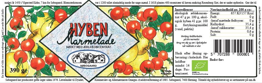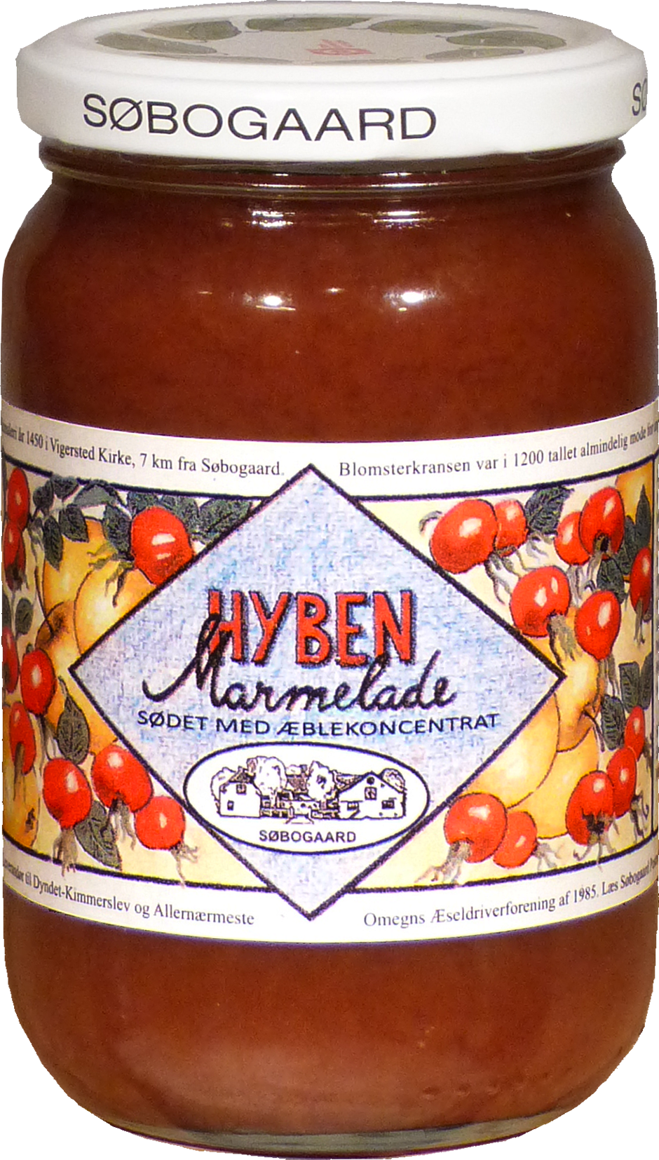 Søbogaard´s Hybenmarmelade æblesødet, er en skøn og delikat marmeladetype, der fremstilles ved hjælp af hyben, de runde, orange til røde frugter, der dannes på vilde roser. De er rige på C-vitamin og giver marmeladen sin karakteristiske smag og farve. Hybenmarmelade har en karakteristisk smag, der kombinerer sødme og en let syrlighed. Den kan bruges som pålæg på brød, pandekager, croissanter eller som fyld i kager og desserter. Denne marmelade er en anelse mere syrlig i smagen, da den ikke er tilsat sukker. Ingredienser: Økologiske hyben, økologisk æblekoncentrat, vand og pektin 390 gram