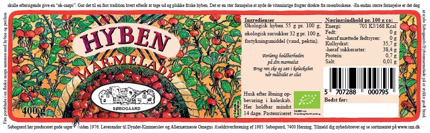 Søbogaard´s Hybenmarmelade er en skøn og delikat marmelade, der fremstilles ved hjælp af hyben, de runde, orange til røde frugter, der dannes på vilde roser. De er rige på C-vitamin og giver marmeladen sin karakteristiske smag og farve. Hybenmarmelade har en karakteristisk smag, der kombinerer sødme og en let syrlighed. Den kan bruges som pålæg på brød, pandekager, croissanter eller som fyld i kager og desserter. Ingredienser: Økologiske hyben, økologisk rørsukker, vand og pektin 400 gram