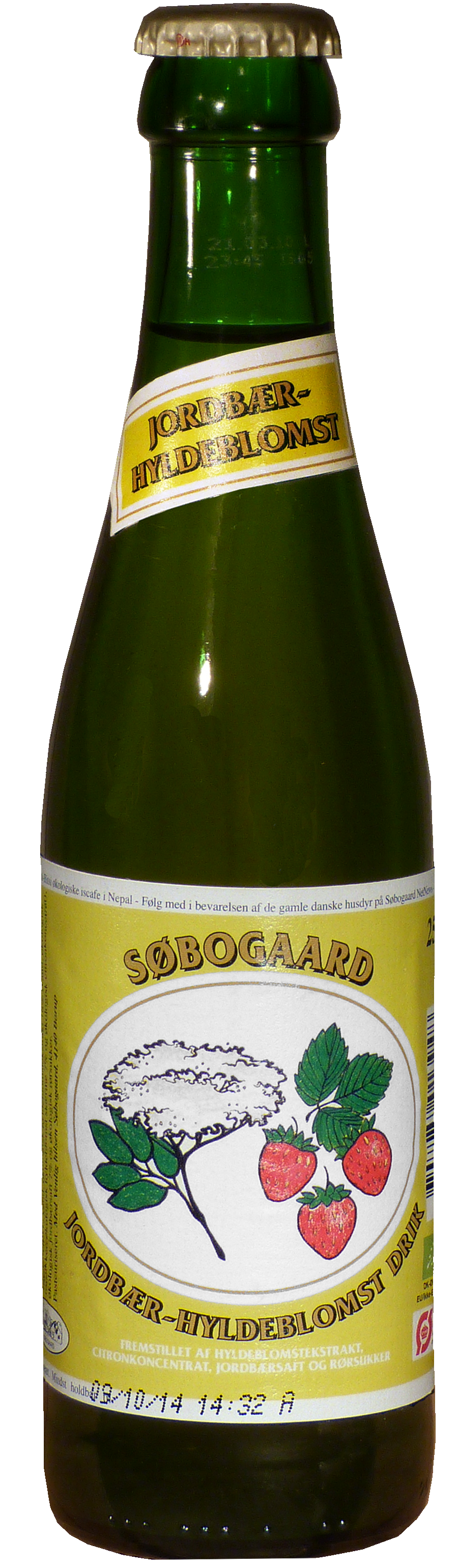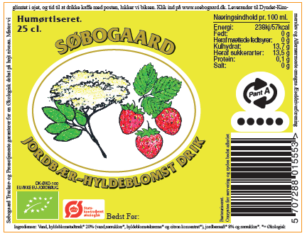 Ingredienser: Vand, økologisk hyldeblomstudtræk 20 %, økologiske jordbær 8 % og økologisk rørsukker