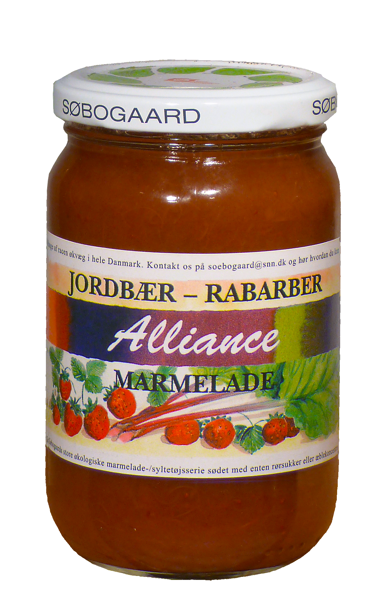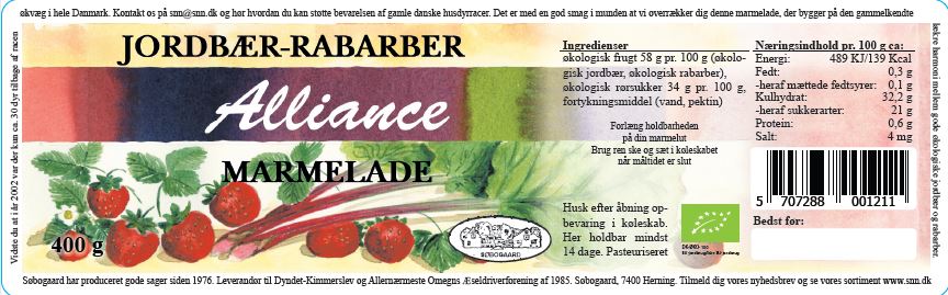 Søbogaard´s økologiske jordbær-rabarber marmelade, er en skøn alliance mellem de solmodne søde bær og de lidt mere syrlige rabarber stilke. Kan som alle andre marmelader anvendes både som pålæg, til pandekager, dessert, bagværk eller som et lille pift på toppen af morgenmaden. Ingredienser: Økologiske jordbær, økologiske rabarber, økologisk rørsukker, vand og pektin 400 gram