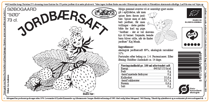 Søbogaard økologisk jordbærsaft, er en klassisk saft – dansk sommer på flaske. Jordbærsaft er en alsidig drik, der kan bruges på forskellige måder og har mange anvendelser. Den mest almindelige måde at bruge jordbærsaft på er som en forfriskende drik. Du kan servere den kold og nyde den alene eller fortynde den med vand eller kulsyreholdige drikke for at lave en læskende sommerdrik. Jordbærsaft er en fantastisk tilføjelse til smoothies. Bland den med andre frugter som bananer, blåbær eller mango, tilsæt yoghurt eller mælk, og du har en lækker og sund smoothie.