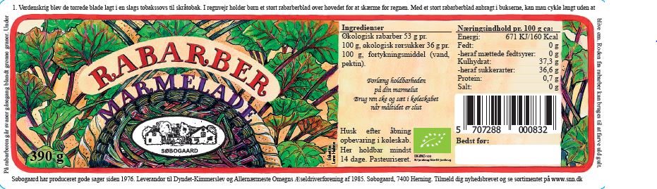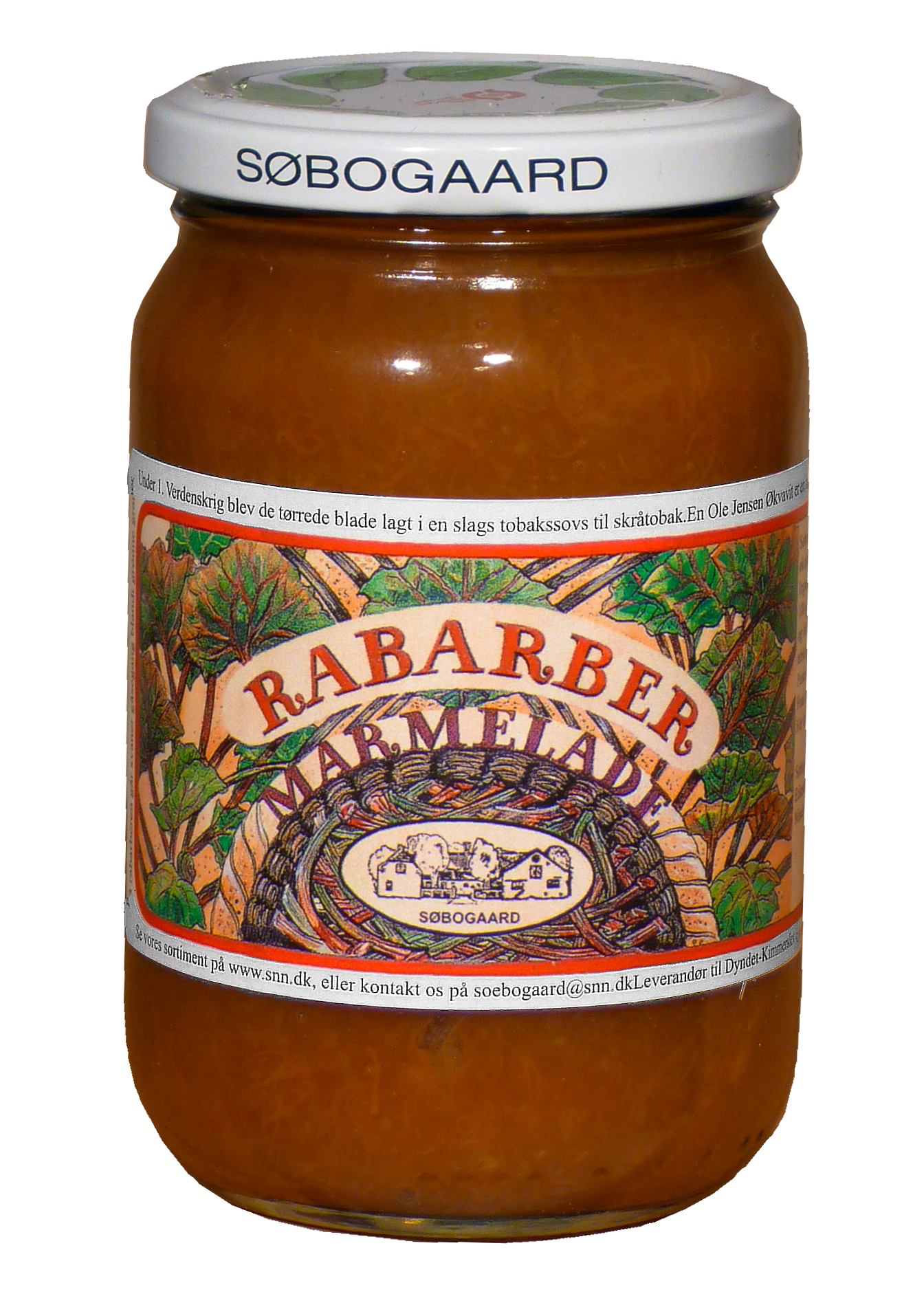 Søbogaard´s økologiske rabarbermarmelade, er en kombination af de list syrlige rabarberstilke og den søde rørsukker – en oplevelse der vil glæde dine smagsløg. Rabarber stammer oprindeligt fra Kina, men har været dyrket i Europa i mange år. Rabarber er også kendt for at indeholde oxal-syre – det sidder dog kun i de store blade, som ikke bør anvendes til madlavning. Ingredienser: Økologiske rabarber, økologisk rørsukker, vand og pektin 400 gram