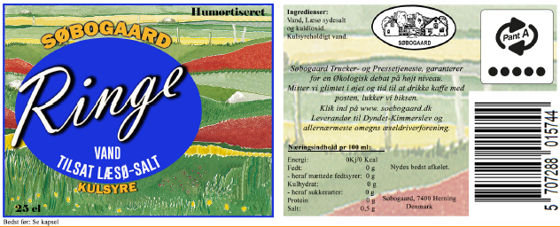 Søbogaard Ringevand er tappet i Ringe på midtfyn og tilsat Læsø Sydesalt, hvilket giver det en frisk smag og boblende kvalitet. Ringevand er en ideel følgesvend til måltider, som en ingrediens i cocktails eller som en simpel tørstslukker.