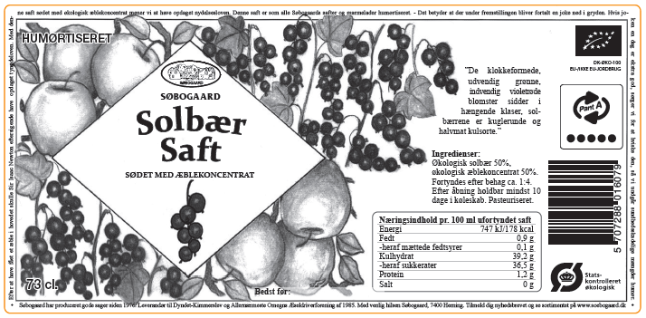 Søbogaard økologisk Solbærsaft æblesødet er en populær drik lavet af solbær, der er små, mørke bær, der vokser på solbærbuske. Solbærsaft er kendt for sin karakteristiske, lidt syrlige smag, der ofte kombineres med en sød undertone. Denne balance af smag gør den velegnet til forskellige drikkevarer og retter.