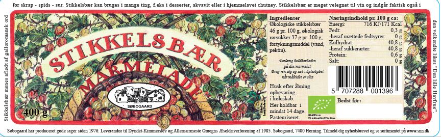 Søbogaaard´s økologiske stikkelsbær marmelade, er en lækker og velsmagende måde at nyde de små runde eller ovale bær. Bærrene er syrlige i sig selv, men med den helt rette balance af syrlige bær og økologisk rørsukker, er den virkelig lækker og et spændende alternativ til de mere traditionelle marmelader. Vidste du i øvrigt, at en skefuld stikkelsbær marmelade i saucen, kan give et virkeligt lækkert pift? Ingredienser: Økologiske stikkelsbær, økologisk rørsukker, vand og pektin 400 gram