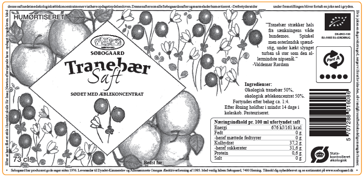 Søbogaard økologisk Tranebærsaft er en populær drik, lavet ved at presse saften ud af tranebær, en rødlig frugt der vokser på lave, stedsegrønne buske.