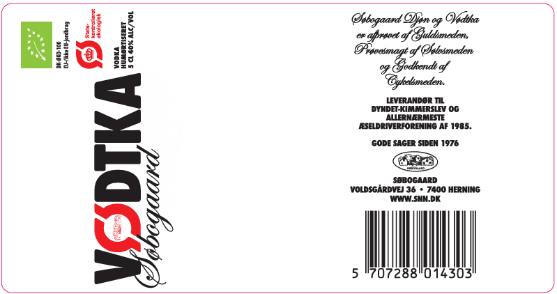 Søbogaard Vødtka er afprøvet af Guldsmeden, Prøvesmagt af Sølvsmeden og Godkendt af cykelsmeden. En af de karakteristiske træk ved vodka, er dens neutrale smag og lugt. Det gør vodka til alsidig spiritus, der let kan indgå i mnage forskellige coctails og drinks, uden at dominere smagsprofilen. Vodka menes at have sin oprindelse i Østeuropa, især Rusland og Polen – hvor den har udviklet sig til at være en vigtig del af både kultur og gastronomi. 5 cl. flaske 40 % alc.
